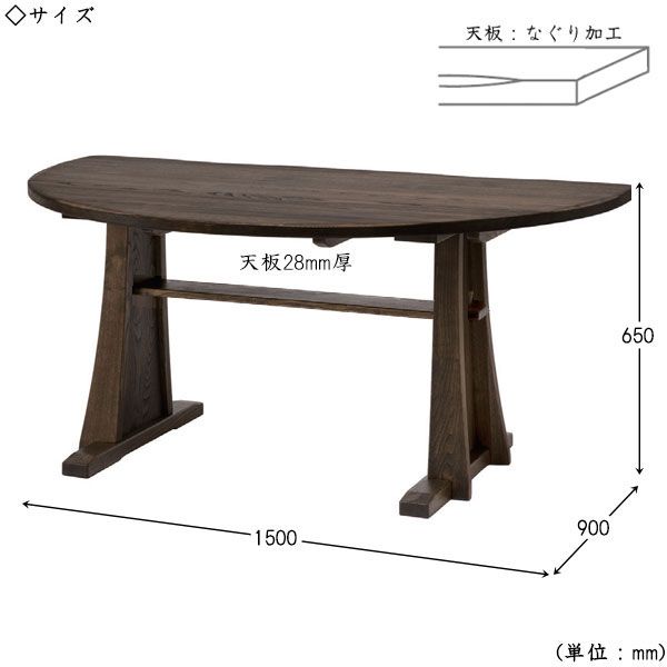 商品仕様 【ダイニングテーブル】 ■サイズ/約W1500×D900×TH650mm ■主材/クリ ■天厚28mm ■PU仕上げ・オイル仕上げ ■棚付き 注意事項 ■掲載商品画像は撮影状態・PC環境などにより実物と色が異なって見える場合がございます。