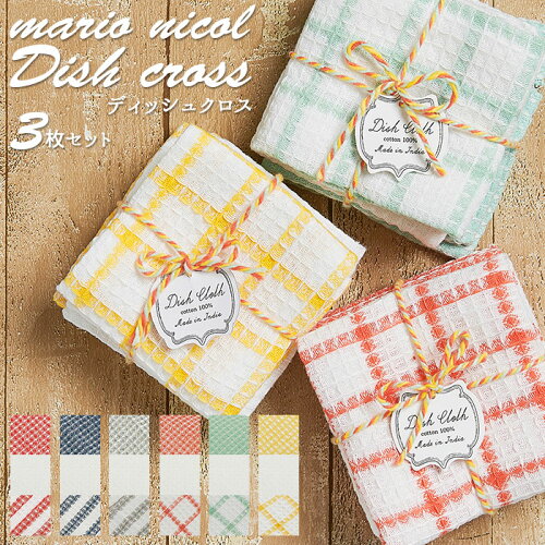 ふきん 食器 定番 シンプル おしゃれ ディッシュクロス かわいい 綿 コットン 3枚セット チェック ボーダー 食器拭き 天然繊維 100% Mario マリオ Nicol ニコル プチギフト 布巾 キッチンファブリック